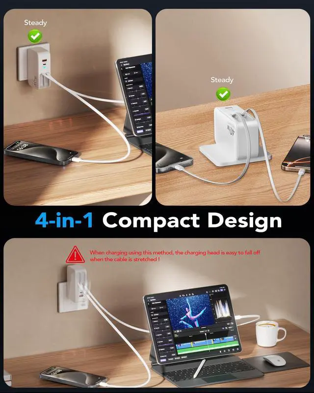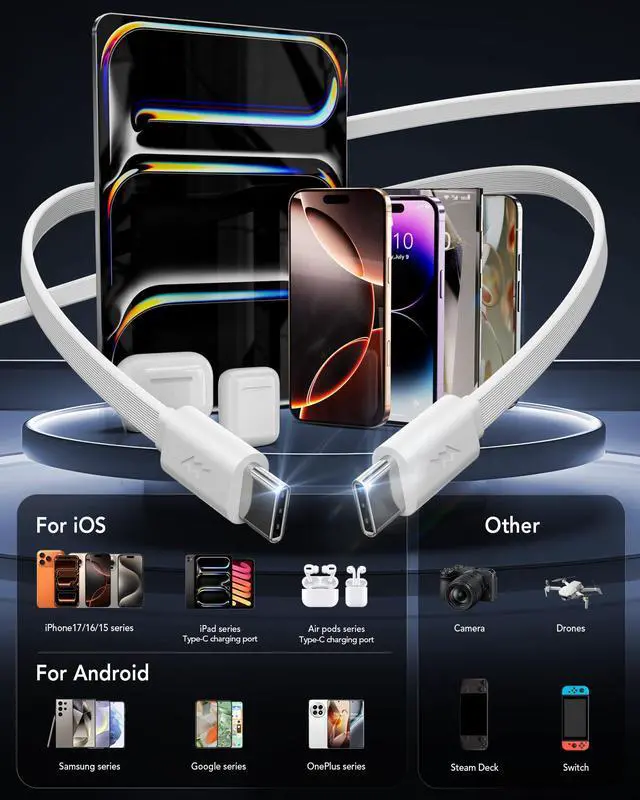 40W Fast Charger for 4 DevicesThe retractable iPhone charger with wall plug has two USB ports and dual retractable Type-C cables, which can charge 4 devices at the same time. Whether it is powering an iPhone, an Android phone (Galaxy, Pixel, etc.), or tablets, it can provide up to 40W fast charging capability.