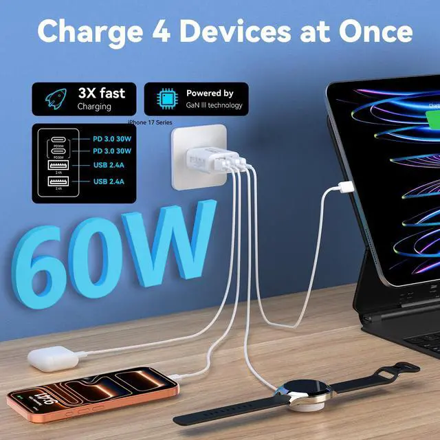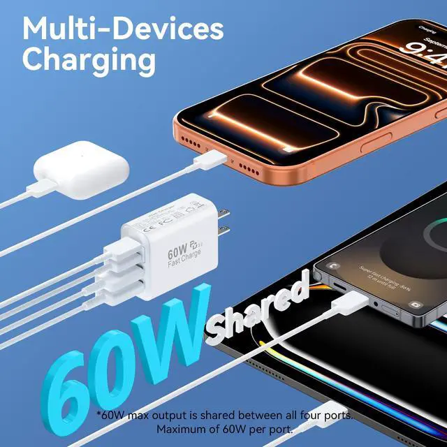 High Speed Charging Cube for 4 DevicesWith 2 USB-C ports and 2 USB-A ports, effortlessly charge your cell phone, tablet, and earphone all at once from a single charger. Connect a single device to charge up to 60W. (The max power of each USB C port is 30W, and the max power of each USB A port is 18W, while charging multiple devices at once, the output power of each port maybe cant reach their max power)