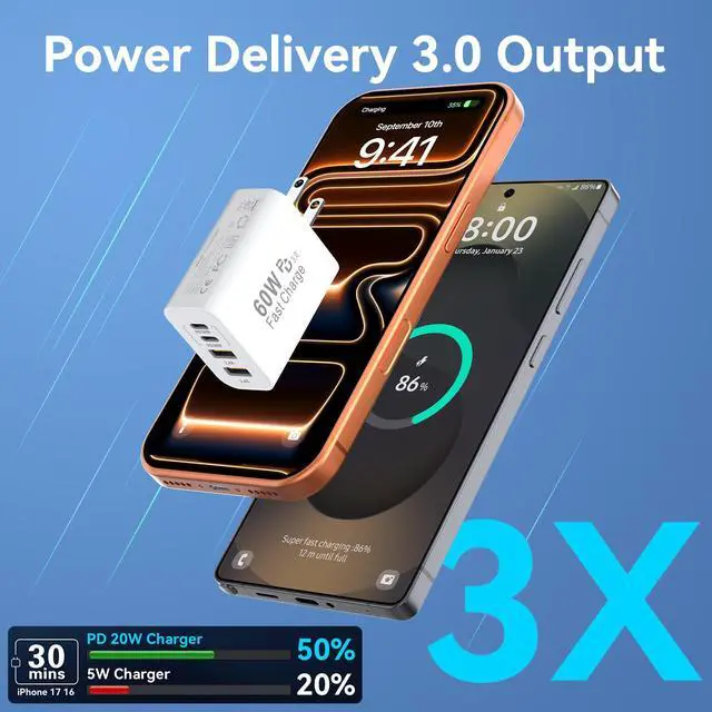 PD+QC Fast Charging BlockThe USB C charger blocks support PD 3.0 and QC 3.0 fast charging technology, which can meet most of devices with fast charging with a total power of up to 60W. The USB-A port offers an output power of 3.1 A/5 V, while the USB-C port offers a charging speed of 30W. Charge your iPhone devices from 0% to 58% in just 30 minutes.