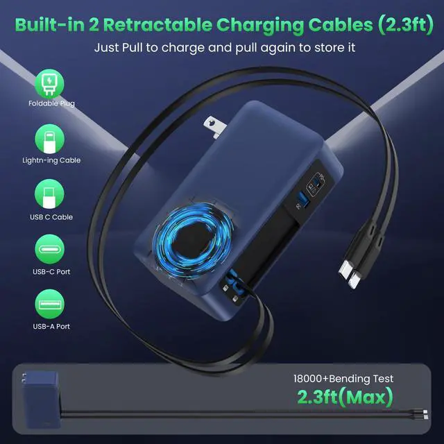 - Fast USB C Charging Station Built-in 2 Retractable Cables and fold-able plug so you charge multiple devices . No more hunting for outlets or lugging around a bunch of chargers when travel, much simplify your life.