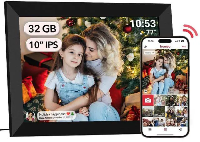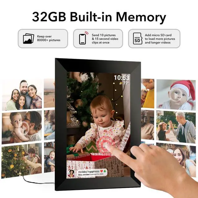 Instant Share via Frameo APP; Connect your frame to WIFI, and share photos and videos(Max.15s) quickly via a reliable App - Frameo to our electronic photo frame from anywhere, privately and safely, no member numbers limited. For those who already have a Frameo digital frame, no need to download another app. It has 32GB built-in memory and support up to 32GB external storage, enables you to share 50,000+ photos. Also, you can transfer via external storage or through a computer, no Wi-Fi needed