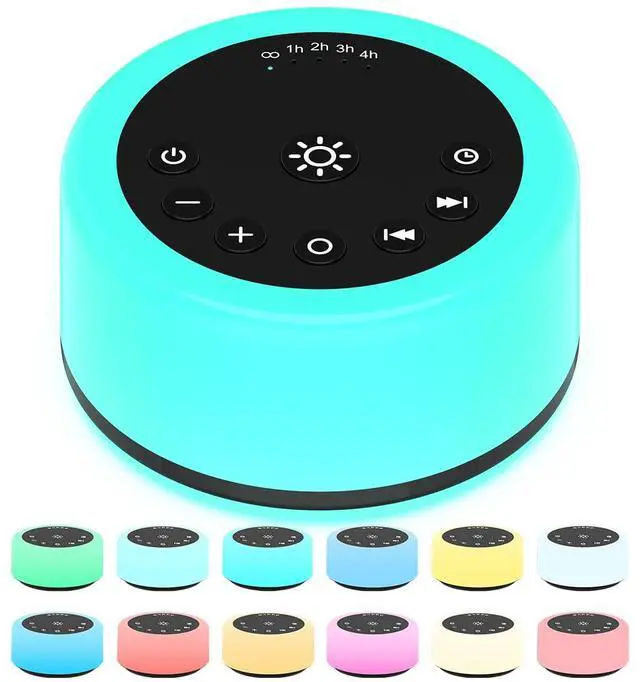 ColourNoise sound machine with 30 fidelity natural sounds, 32 volume levels, 12 light colors, and 10 light levels.Built-in white noise, fan sound, natural sound, piano, meditation, bonfire, bird, wave, lullaby, heartbeat, and a total of 30 fidelity sounds for you to choose from.
