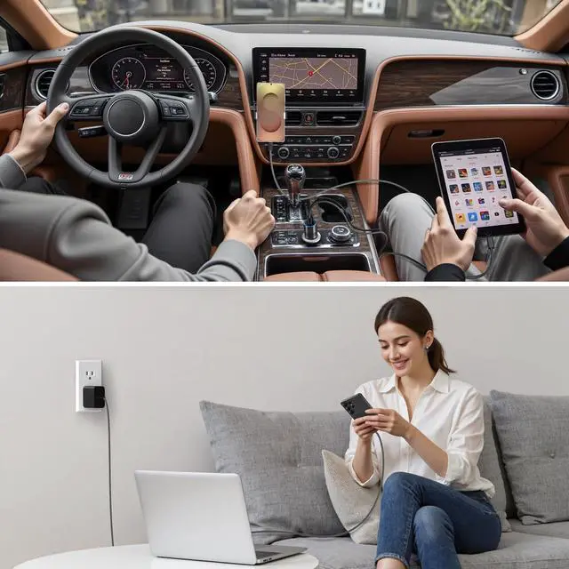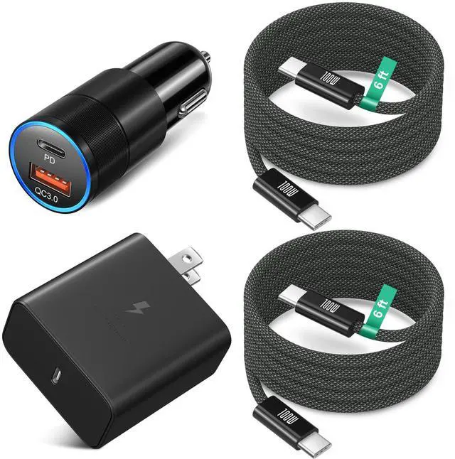 The package includes 1x 45W usb c wall charger, 1x 38W dual ports car charger, 2 x100w usb c to usb c cables.