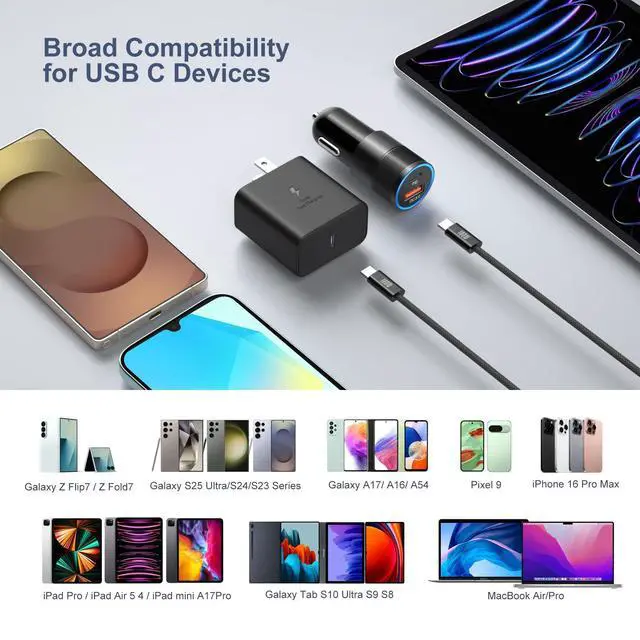 Besides Samsung Galaxy S25 Ultra, S24 Ultra, S23 Ultra, S22 Ultra, Tab S10 and Tab S9, it also fast charges iPhone 16 Pro Max, iPhone 15 Pro Max, iPad Pro, iPad Air5, Pixel 10 and Pixel 9.