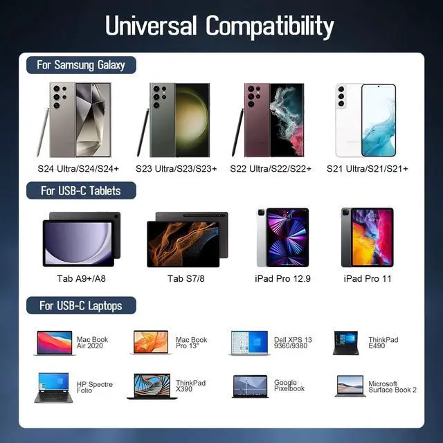 Wide Compatible Devices: 45W Super Fast Charging 2.0 supports up to 45W Super Fast Charging for Samsung Galaxy S25, S25 Ultra, S25+, S24 Ultra, S24+, S24, S23, S23 Ultra, S23+, S22, S22+, S22 Ultra, Note 10+, Note 10+ 5G, A91, and future compatible devices, while also providing up to 25W Super Fast Charging 1.0 for Samsung Galaxy S21/S21 Ultra/S21+ 5G, S20/S20 Ultra/S20+/S20 FE, Note 10/Note 10 5G, Note 20/20 Ultra 5G, S10 5G, Galaxy Z Fold 3/4/5/6, Galaxy Z Flip 3/4/5/6, A90 5G, A80, A70, Book S, and Galaxy Tab S7/S7+/S8/S8+/S8 Ultra.
