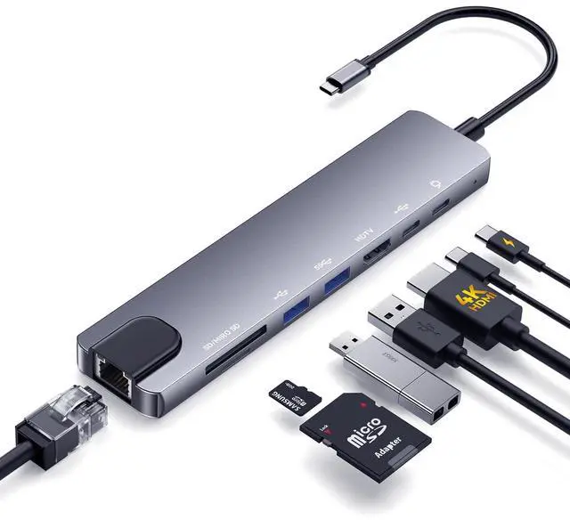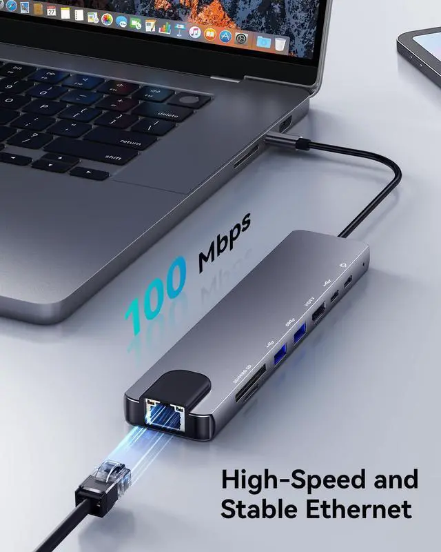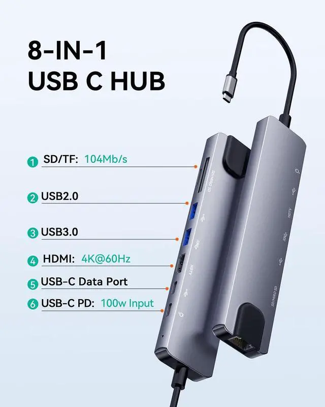 8-in-1 USB-C Hub with EthernetExpand a single USB-C port into 8 essential ports:1×HDMI (4K@60Hz), 1×USB-C PD (100W), 1×USB-C data (5Gbps), 1×USB-A 3.0, 1×USB-A 2.0, 1×Ethernet (100Mbps), 1×SD, 1×TF. More functional than typical 7-in-1 hubsideal for work, office, meeting and travel.