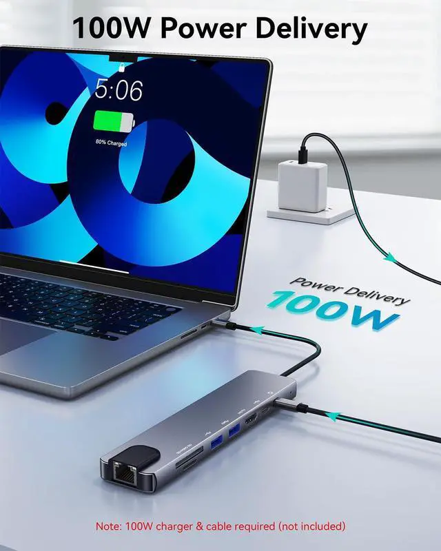 100W Power Delivery Fast ChargingThe USB-C PD port provides up to 100W input (87W max output) to keep your laptop powered while all other ports are in use. No need to sacrifice performance for charging. For best results, use a 65W or higher power adapter.