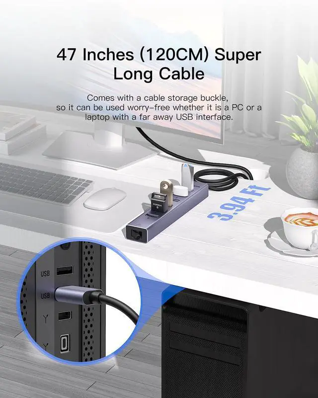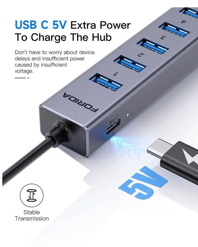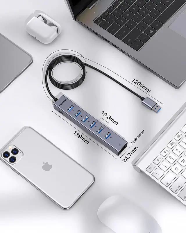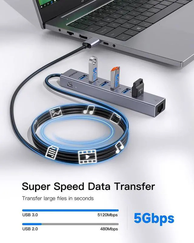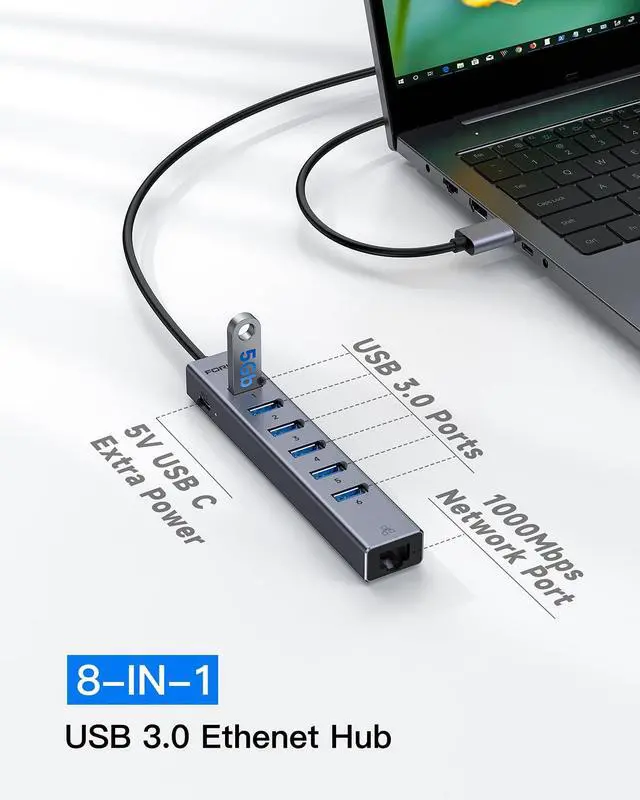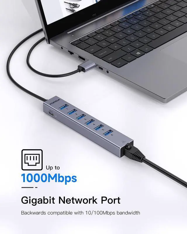 This is a USB 3.0 hub with a network port, featuring 6 USB 3.0 data transfer ports, one Type-C power port for hub itself, and one Gigabit Network port. This USB hub for laptops allows you to transfer data and connect to the ethernet simultaneously.