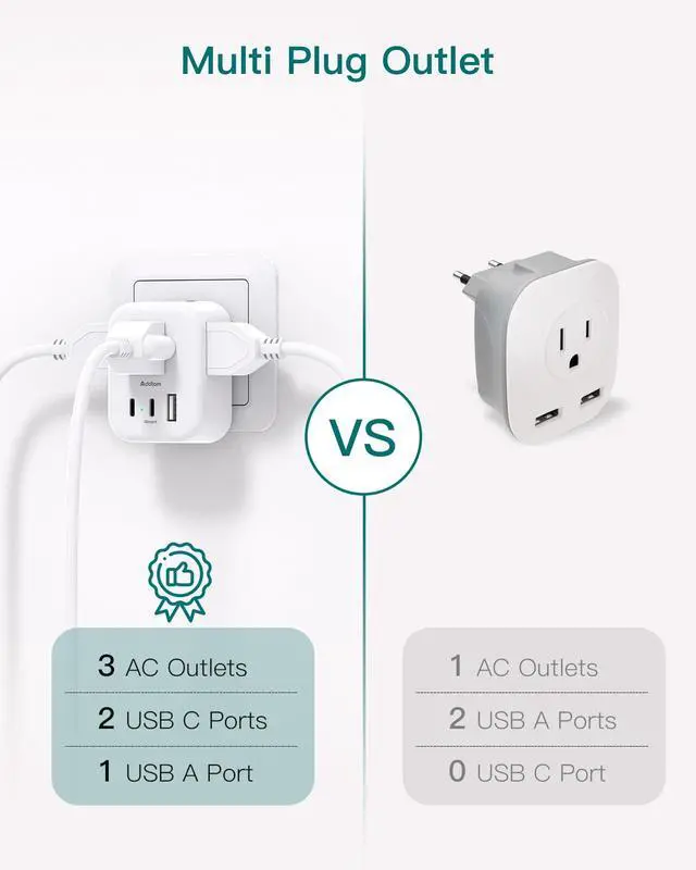 Upgraded travel adapter added 2 USB-C ports to meet more charging demand. USB-C port can up to 15W/5V/3A max which is up to 30% faster than other chargers