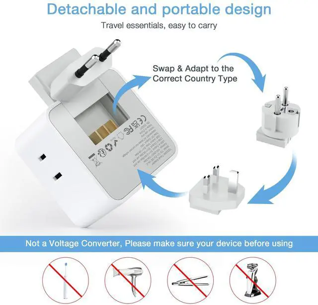 Includes Type C, Type E/F and Type G detachable attachments; It can be easily Swap and Adapt to the travel plug type that you need