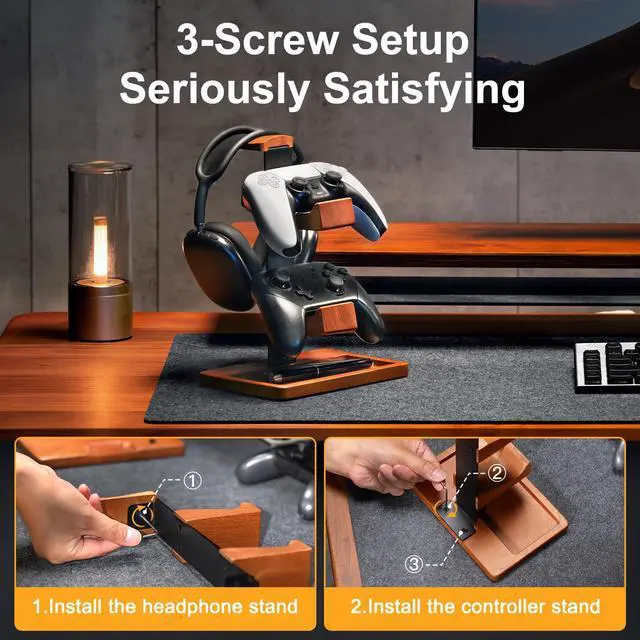 EASY ASSEMBLY Quickly set up this solid wood and metal controller and headphone stand by tightening just three screws. Installation is simple, satisfying, and stress-free, bringing a sense of accomplishment.
