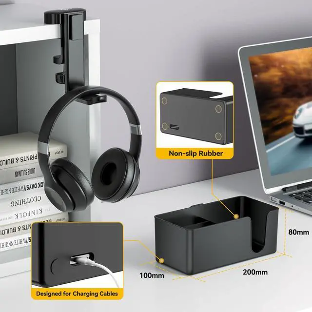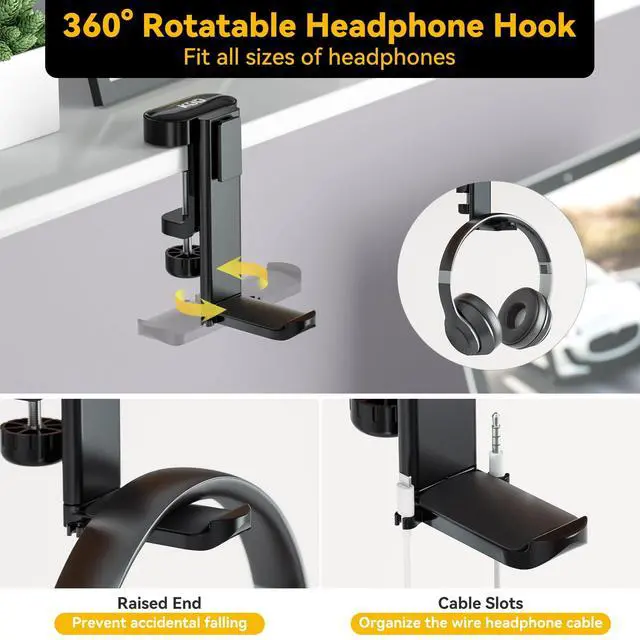 The headphone hanger can rotates 360 degrees and can be hidden under the desk when not in use, release more office space.