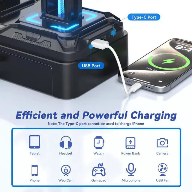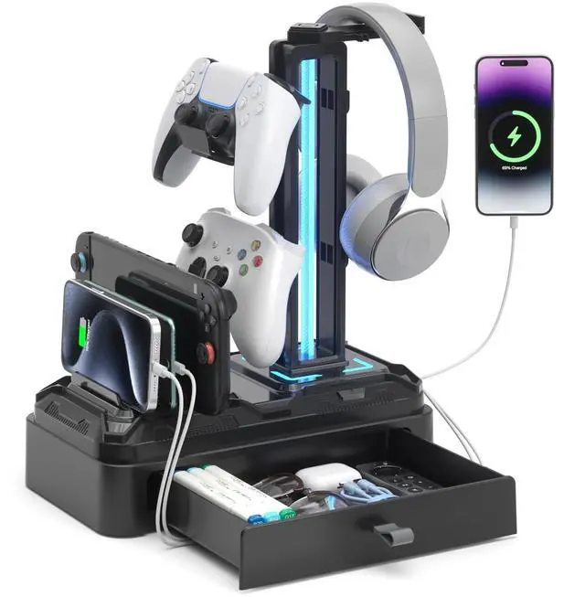 It can hold one headphone and two controllers at the same time, or four game controllers. It is compatible with a wide variety of controllers.