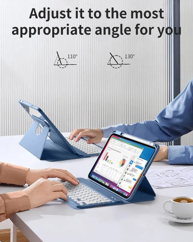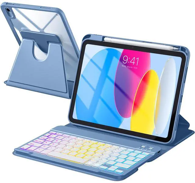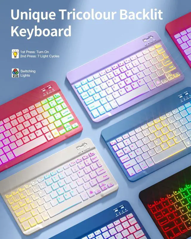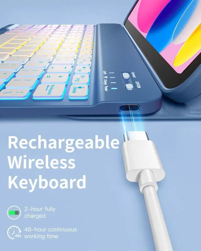 Vibrant 7-Color RGB Backlit Wireless KeyboardUnlike single-color keyboards, this keyboard case for ipad 10th generation features backlighting that displays three colors simultaneously, making typing more fun at night. Choose between a captivating automatic color-cycling mode or manually select your preferred static color combination for personalized style and provided much more convenience when typing, writing,chatting at night.