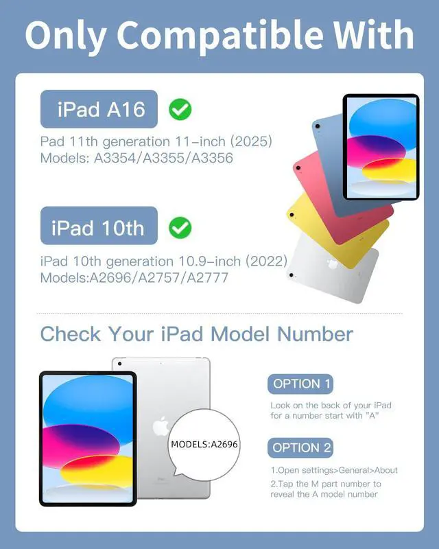 CompatibilityThis keyboard case is designed exclusively for iPad A16 11th generation 11 inch released in 2025 (Models A3354/A3355/A3356), and for iPad 10th generation 10.9 inch released in 2022 (Models A2696/A2757/A2777). Confirm your model numbers for iPad a16 case with keyboard (found on the back bottom, starting with "A") before purchase.