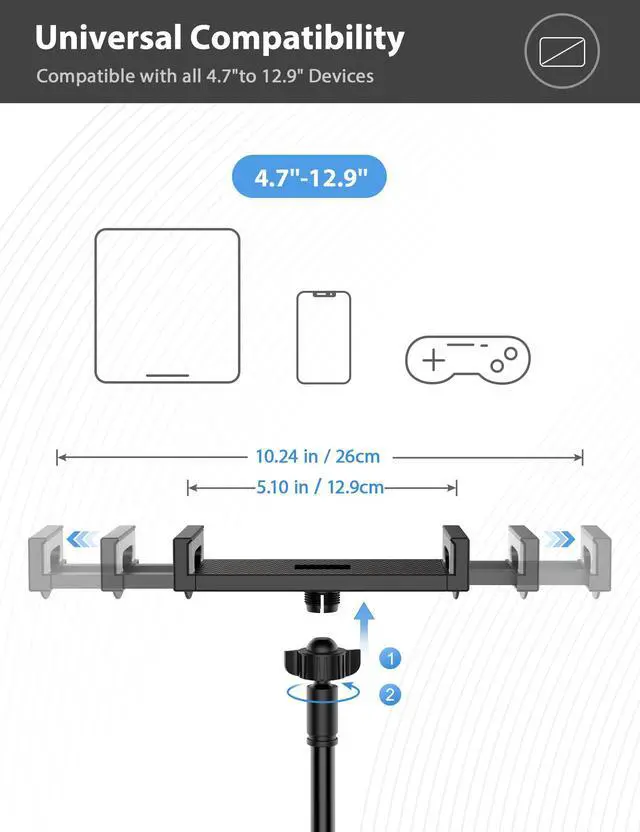 Universal Compatibility VIVI MAO tablet holder has a wide range of compatibility, suitable for almost all 4.7-12.9 inch devices on the market, such as iPad mini 2 3 4 5,iPad Pro 9.7 10.5 11 12.9, iPad Air 2 3 4, Galaxy tabs, Switch, Fire HD tab , iPhone 13 /pro Max /Pro/X/11 10 8 7 6 , Samsung Galaxy Tab 10.1" 10.5" 9.7" 9.6" 8", Kindle Fire HD 7 8 10 , ect. In addition, the tablet phone is equipped with silicone pads, which will protect your device from scratch and damage.