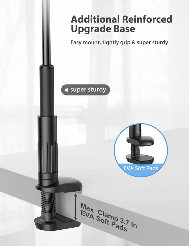 Additional Reinforced Upgrade BaseReinforced and thickened base, not easy to break. Non-slip silicone pads are added to the base clip to avoid damage to your furniture. The base has a maximum clamp size of 3.7 inches, maximizing usability. Whether you're laying in bed watching movie, viewing recipes in the kitchen,exercising in the gym, or using your devices anywhere, you don't have to worry about falling and breaking it.