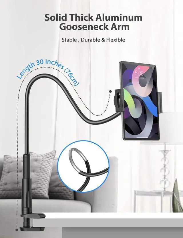 2024 Upgrade Stable Tablet Stand Made of Heavy duty aluminum-magnesium alloy solid cord , stiffened material, very sturdy and flexible. 30 inches (76 CM) Overall Length from bottom to top. Moreover, compared to most of the tablet stands on the market, our tablet holder is upgraded, the bottom is additionally reinforced to ensure its maximum stability. Make it strong and sturdy to protect your cellphone and tablet.