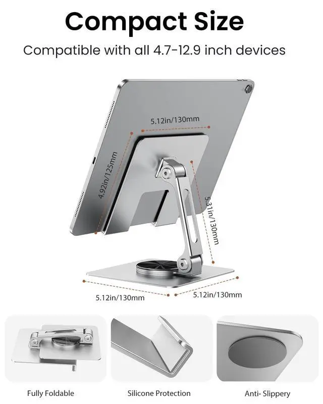 : The foldable design allows you to carry it with you and use it anytime and anywhere. Whether for travel, work, home use, or study, it's convenient. You can easily fold it and store it in your bag, providing stable support whenever needed. The anti-slip silicone pads prevent the tablet from moving or getting scratched.