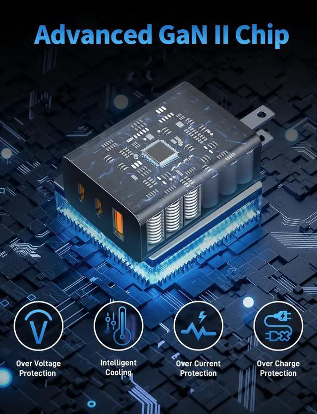 Citelect’s Advanced GaN II Chip charger: 3 ports (65W/20W USB-C + 18W USB-A) deliver 100W fast charging block power. Features Over Voltage/Current Protection, Intelligent Cooling, Over Charge Protection. Safe, compact, ideal for all devices!