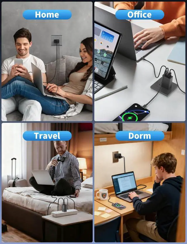 Experience versatile charging! Single-port: PD 65W (laptop), 20W/18W (mobiles). Dual-port: PD 45W + dynamic split (65W Max). Triple-port: 45W + 60W Max + 15W. Fast, efficient multi-device charging—ideal for travel/work.