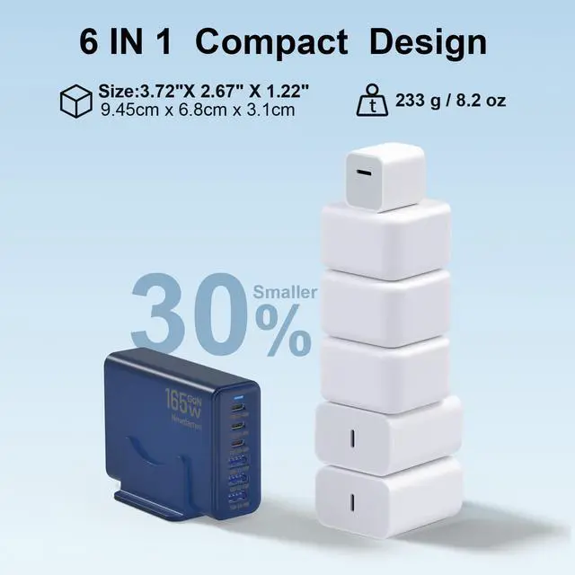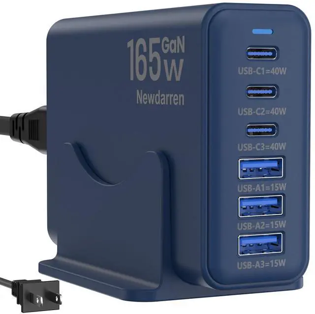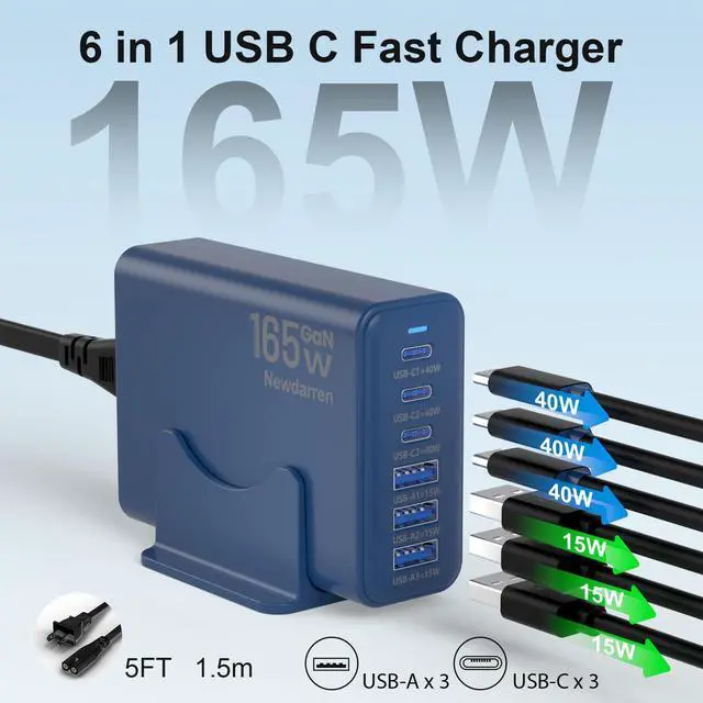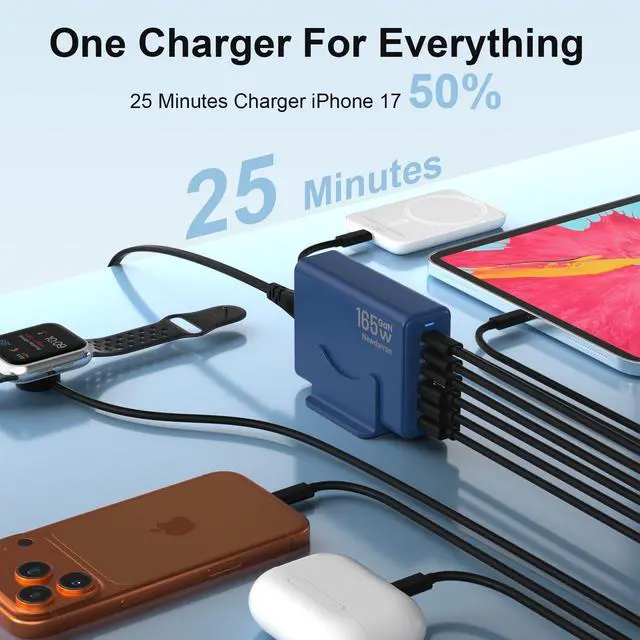 Ultra-Fast Desktop Charging StationGet Your iPhone 17 To 50% In Just 25 Minutes. This 6-In-1 Charging Hub Features 3 Usb-C Ports (40w Max Each) and 3 USB-A Ports (15w Max Each), With A Combined Output of Up To 165W. Charge Six Devices SimultaneouslyLike Your Smart Watch, Earbuds, hand Fan, Power Bank and MoreWith No Waiting.