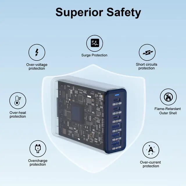 Safe and Efficient ChargingEquipped With Smart iC Identification and Multi-Protection Systems Against Over-Current, Over-Voltage, Over-Heating and Over-Charging. Automatically Stops Charging When Devices Are Full To Ensure Safety And Extend Battery Life.