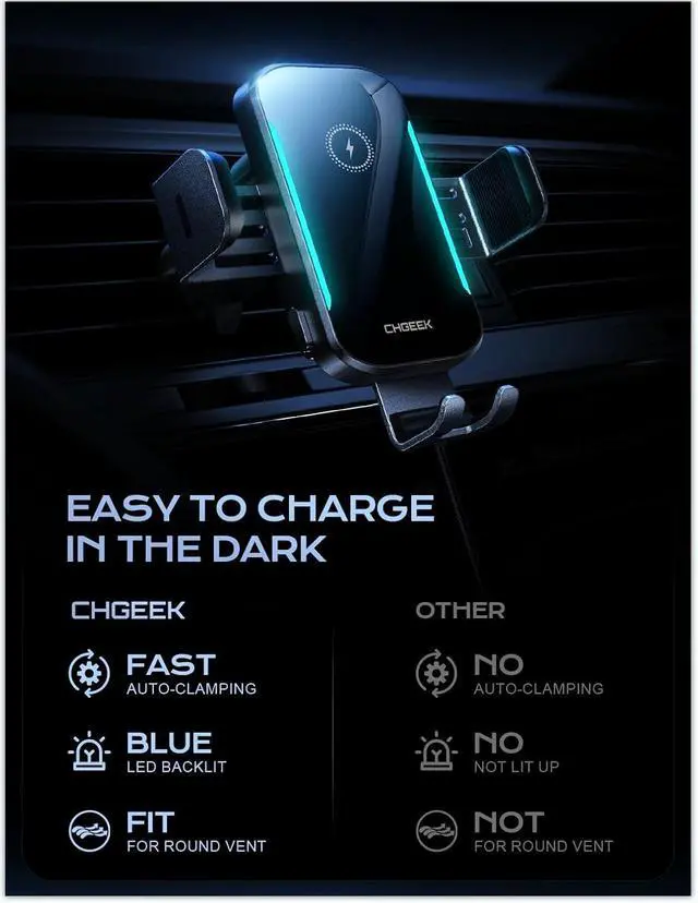 Transform your drive with the CHGeek 15W Wireless Car Charger a secure, hands-free mount that keeps your phone charged and visible during every journey. The auto-clamping mechanism uses sensors to detect your device and automatically locks it in place, ensuring seamless one-handed use while driving. The 360° adjustable arm lets you position your phone for ideal viewing without obstructing your line of sight. Designed for safety and ease, the soft-touch vent clip grips firmly without damaging your cars air vents, while the discreet blue LED subtly indicates charging status. Built to Amazons electronics compliance standards, this charger supports consistent Qi-certified fast charging and maintains stable performance through daily use.