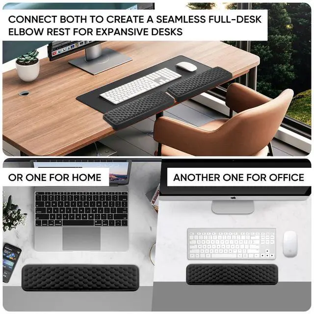Versatile 2-in-1 ComfortOur desk elbow pad(14.9inch)is longer, but that's the genius! Connect both to create a seamless full-desk elbow rest for expansive desks, or use them separatelyone for home, one for office. It's two purchases in one, offering unparalleled flexibility and double the comfort!
