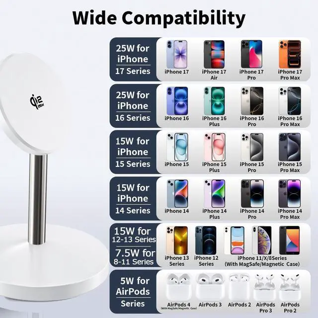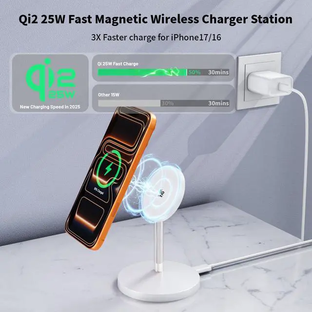Qi2.2 certified magnetic wireless charger delivers up to 25W fast wireless power for iPhone.