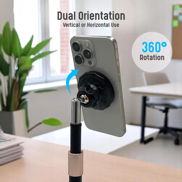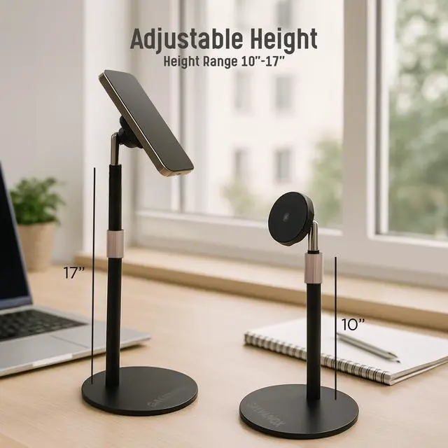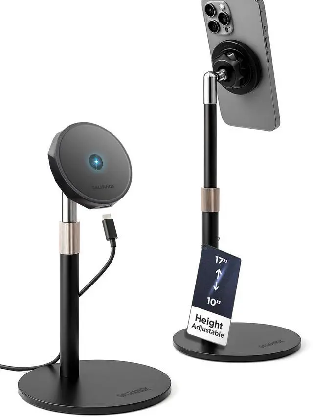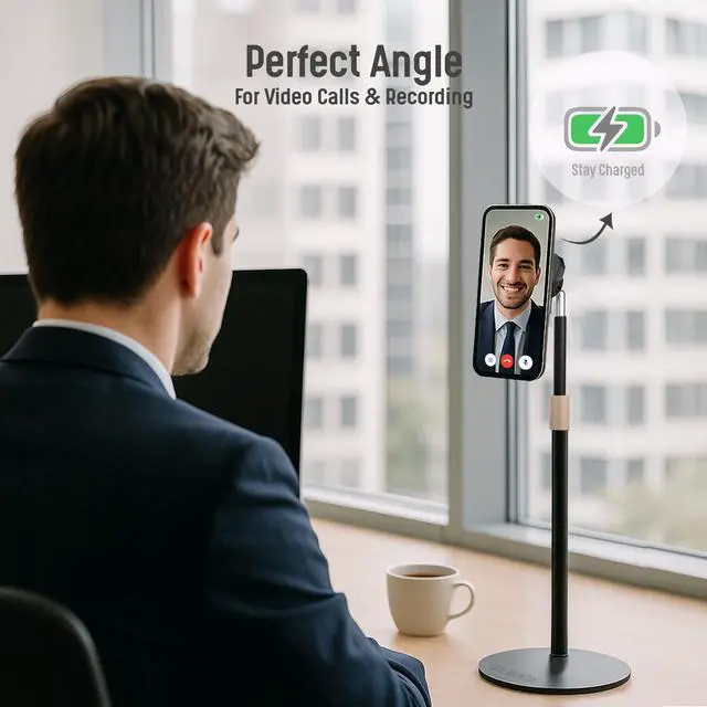 This versatile desktop stand offers a convenient solution for seamlessly integrating your phone into your workspace. Effortlessly charge your device while maintaining easy access for video calls, streaming, or simply keeping your phone within reach. The adjustable height and 360-degree rotation allow you to find the perfect viewing or recording angle.