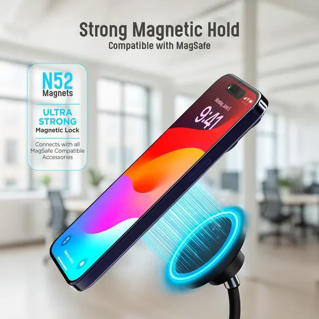 Strong magnets ensure your phone remains securely in place, allowing for uninterrupted charging while you record videos, stream content, or conduct video calls. The included 1.5M USB-C cable and cable management strap maintain a tidy workspace. The durable metal construction and non-slip base provide stability and prevent accidental tipping.