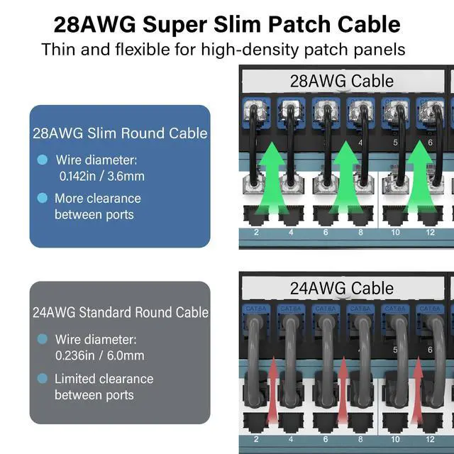 Slim patch cables help reduce cable clutter in network racks and patch panels.