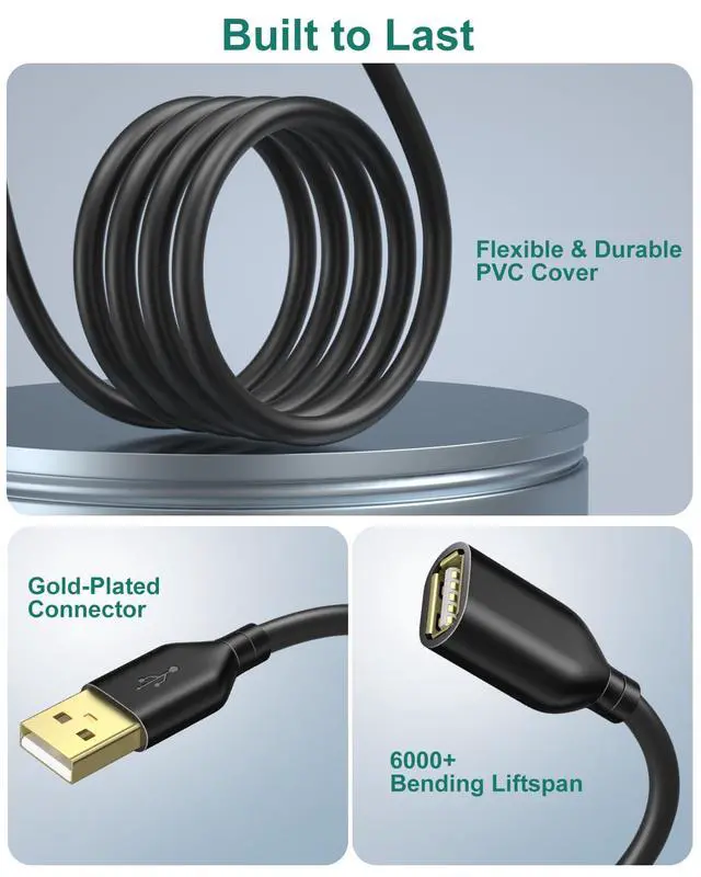 ![Alt view image 5 of 7 - USB Extension Cable, 10 ft [5Pack] Extra Long Type A Male to Female USB 2.0 Extender Cord USB A Charging & Data Transfer for Keyboard, Mouse, Printer, Flash Drive, Phone, LED Lights-Black](https://c1.neweggimages.com/productimage/nb640/C5MSD26031606EIOFB2.jpg)