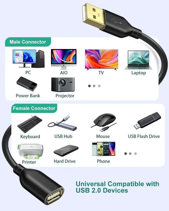 ![Alt view image 6 of 7 - USB Extension Cable, 10 ft [5Pack] Extra Long Type A Male to Female USB 2.0 Extender Cord USB A Charging & Data Transfer for Keyboard, Mouse, Printer, Flash Drive, Phone, LED Lights-Black](https://c1.neweggimages.com/productimage/nb640/C5MSD26031606EG3VAE.jpg)