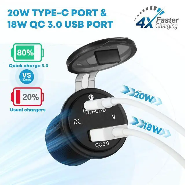 Quick Charger 3.0 USB Port: Max single output up to 18W, 4X faster than traditional ports.
