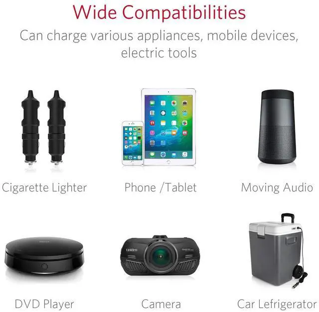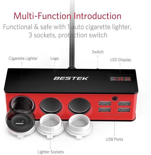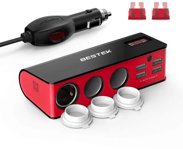 BESTEK upgraded cigarette lighter adapter offers 3 DC outlets,provide a total output power of up to 200W, allowing you to use multiple 12V/24V car appliances simultaneously.