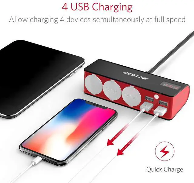 4 USB charging ports provide total 6A/5V output, ideal for powering 4 mobile devices at the same time.