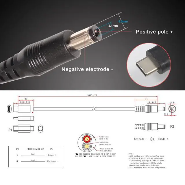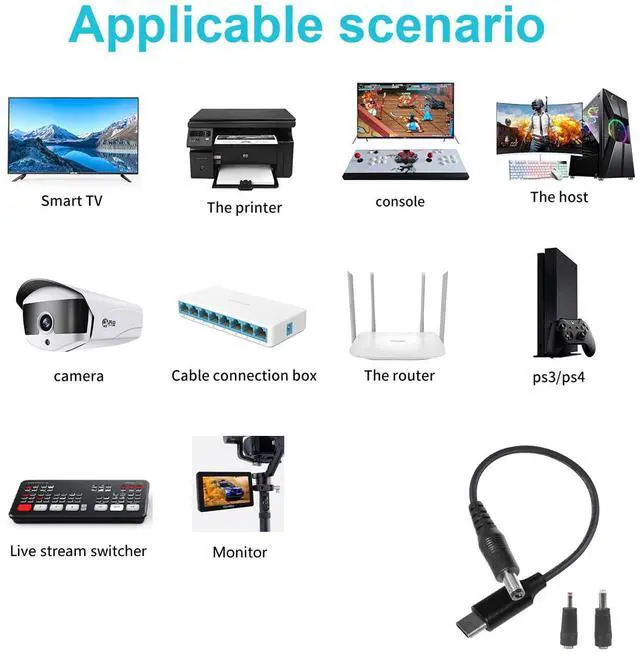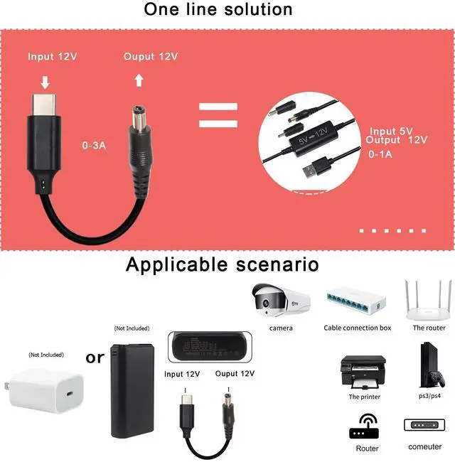This 3.3' long male USB-C PD to Male DC 5.5mm OD, 2.1mm centre pin power cable, and DC converter adapters enable you to power your 12V device using an external PD power bank or PD charger that have USB-C power delivery capabilities. Power input is from usb-c plug and output is DC jack (match 2.1mm x 5.5mm, 2.5mm x 5.5mm and 3.5mm x 1.35mm DC ports), that plugs into your 12V device. The output power of your PD power supply must exceed the input power of your 12V device.
