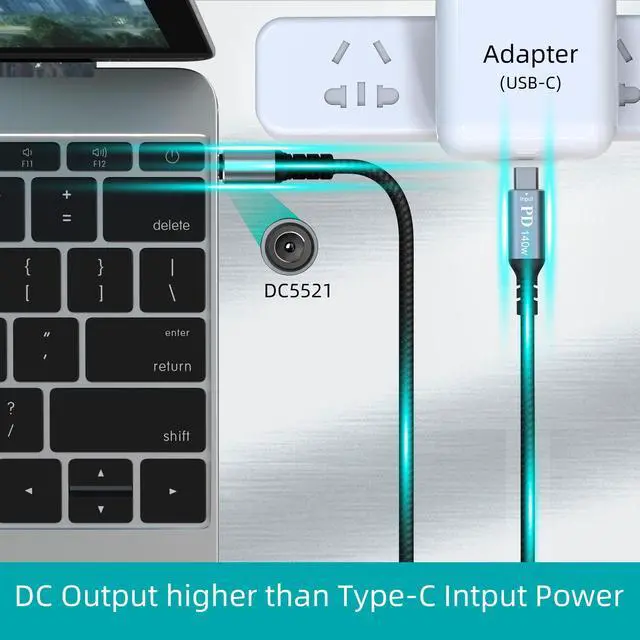 Designed to charge notebooks for Laptop with DC 5.5mm x 2.1mm port. Using a 140W PD wall charger outlet with USB-C port.