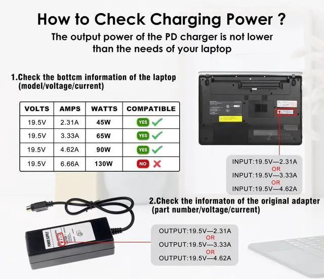 - Charging speed may vary depending on your laptop and wall charger adapter, we recommend using a USB-C PD charger adapter or USB-C PD mobile power supply. The output power of PD charger should NOT be less than the input power of your laptop; e.g. the output of laptop original power adapter is 19V/3.33A 65w, then you need a 65w PD charger adapter to get the item to work properly.