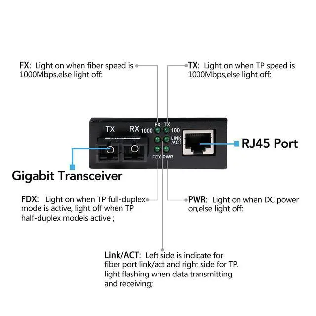 2.Interface: Dual SC Port+RJ45 Port, RJ45 Port Data Rate: 10/100/1000M auto-negotiation.