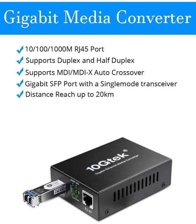 - Gigabit SFP to RJ45 media converter comes with a 1000Base-LX SFP Transceiver, Singlemode LC, 1310nm, up to 20km.