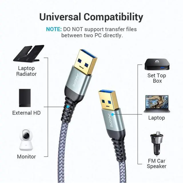 WIDE COMPATIBILITY: AINOPE USB A to USB A cable connects a USB peripheral with USB 3.0 type A port to a computer for speedy file transfer. The usb a to a cable compatible with Laptop, Laptop Cooling Pad,Smart TV,USB in car, DVD player, USB 3.0 hub, Monitor, Camera, Wacom, Blue-ray Drive, Set Top Box, 2.5-Inch External Hard Drive Enclosure with Type A port, and most USB 3.0 external hard drives with Type A port.