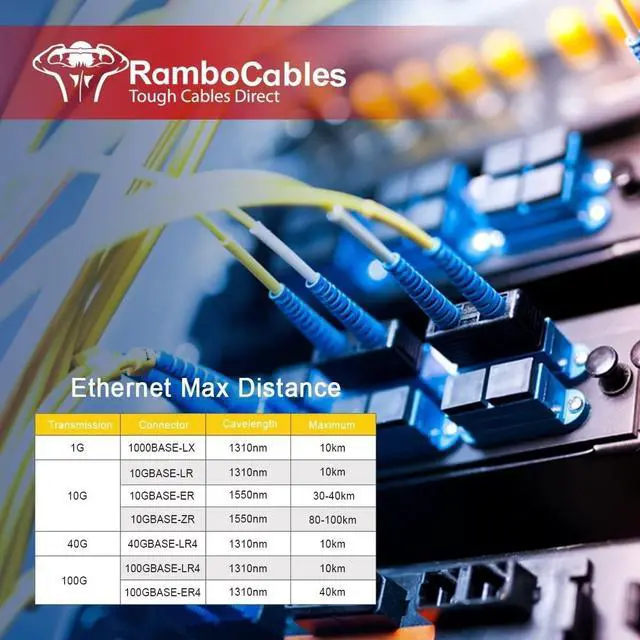 RamboCables OS2 Single Mode Fiber can achieve transmission rates from 1 to 10 GbE at various transmission distances. It's ideal for connecting 1G/10G/40G/100G/400G Ethernet connections. It can transport data for up to 10km at 1310nm, or up to 40km at 1550nm.