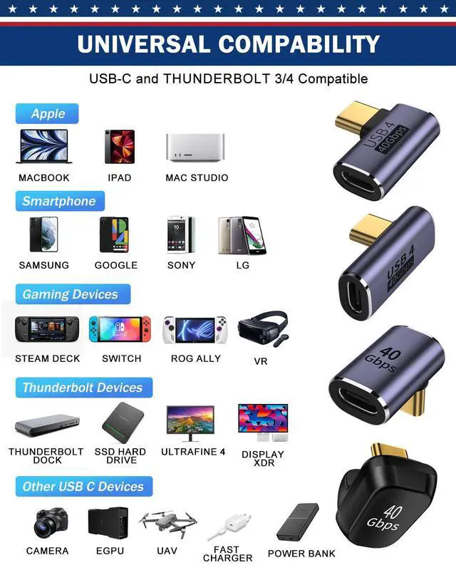 | Suitable for | Laptop, iphone 15, Steam Deck, Nintendo Switch, MacBook Pro, Surface Book 2, Samsung Galaxy S21 S20, S10, Note20 10, LG G7 V20, Google pixel, Chromebook, etc | iPhone,Samsung Galaxy s22 21, s20+ S20Ultra , Note 10 S20 Plus ,Google Chrome book, Pixel 7 6 5 4 3 XL,Apple Macbook Ipad Pro | Monitor, PC, DVD Player, Camera, Cell Phone, Antenna, Speaker, Printer, Amplifier, TV Box, Headphones, MP3 Player, MP4 Player, Car Audio & Video, Projector, Microphone, TV, Telephone, Video Game Console, VHS Recorder | scanner, printer, server, camera such as HP, Canon, Lexmark, Epson, Dell, Xerox , Samsung and other | GoPro Hero HD, Hero 3+, PS3 controller, Astro A40/50, MP3 player, Digital Cameras like Canon, Sat Navigation, Garmin GPS Receiver, Zoom Mic, Dash Cam etc and other devices with Mini 5 Pin connector |