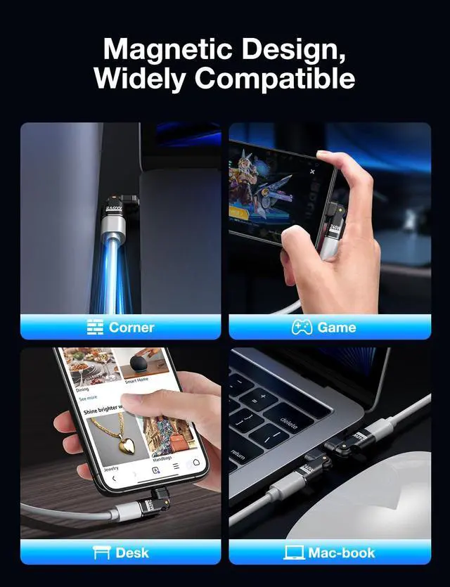 Universal Compatibility The magnetic USB C adapter is compatible with most USB C devices, such as 1Phone 16/15 Plus/15 Pro/15 Pro Max, Ma-Book Pro/Air, 1Pad, for Samsung Galaxy series, and other laptops, tablets and smartphones with USB C, Type C interfaces. The usb c right angle adapter meeting your various daily needs.