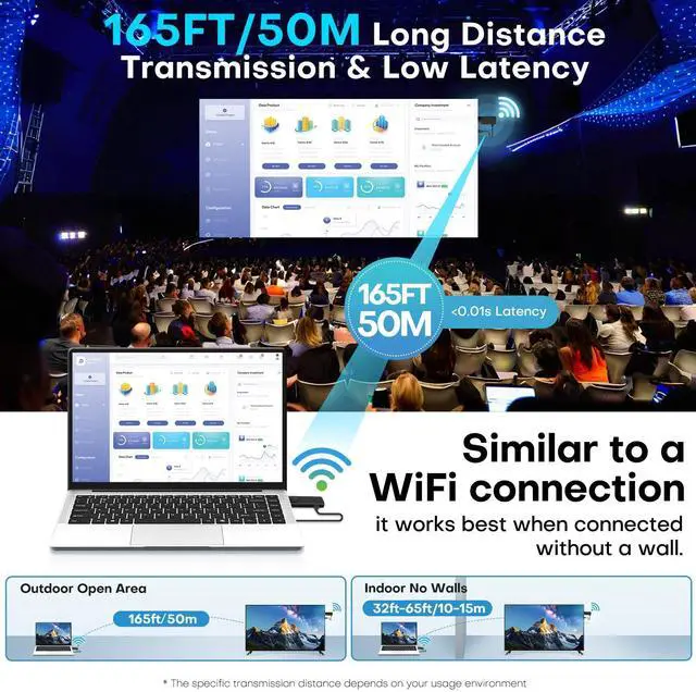 Our Wireless HDMI adopts dual-band 5.8GHz/2.4GHz WiFi transmission chip. The built-in antenna ensures efficient transmission of video and audio with low latency, making it easy to enjoy high-definition video and audio on the big screen. In an open and unobstructed space, the transmission distance can reach up to 165 feet/50 metres, but if there is an obstacle, the transmission signal will be weakened and the transmission distance may only be about 65 feet/15 metres. Similar to WiFi signal transmission.