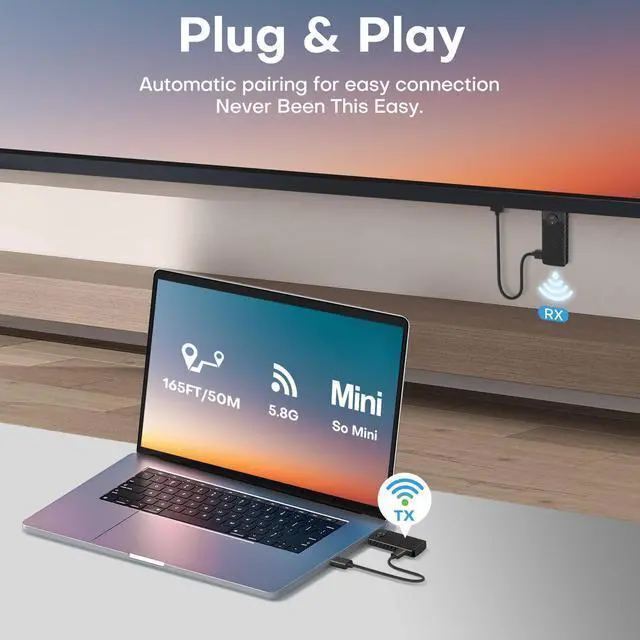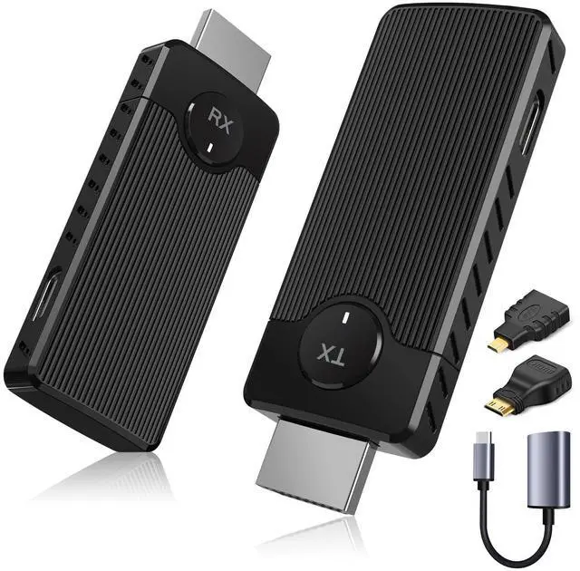 The high compatibility of wireless HDMI supports different HDMI port devices. The package comes with a variety of adapters to help you make the best use of wireless HDMI. including: Mini HDMI adapter+Micro HDMI adapter+HDMI to type-c cable. So it's easy to convert mini/micro/standard HDMI ports on laptops, camcorders, cameras, tablets, PCs, Blu-ray players, DVDs, DVRs, set-top boxes, and cable/satellite TV boxes to TVs, monitors, or projectors!