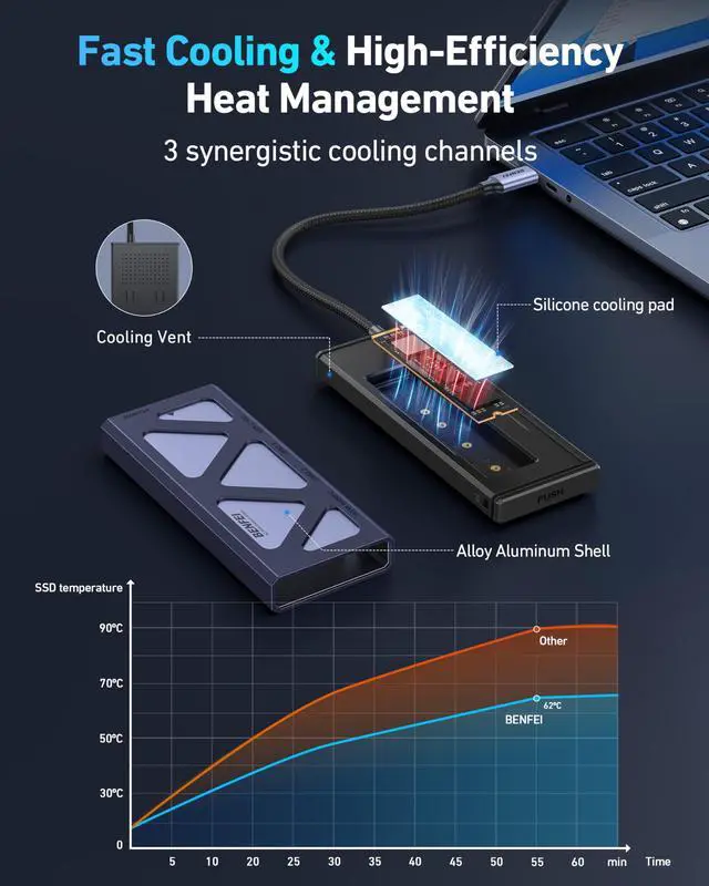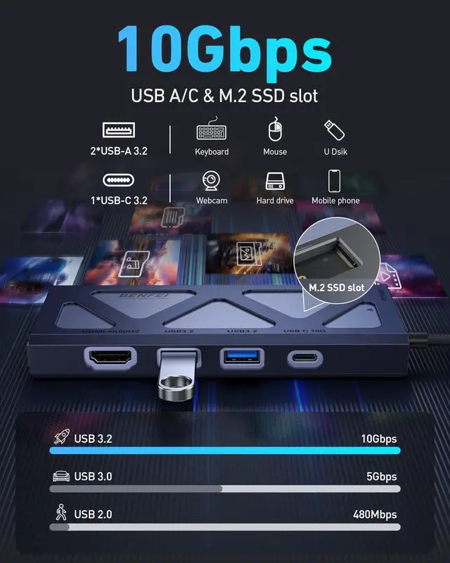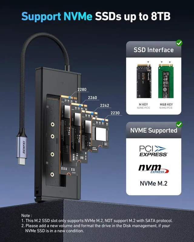 Plug & Play M.2 NVMe SSD ExpansionBuilt-in M.2 NVMe SSD interface with a transfer rate of up to 10 Gbps, read/write speeds of up to 900 MB+/S (actual speed depends on SSD performance).ideal for gaming, video editing, or backups. Tip: New SSDs need formatting before use